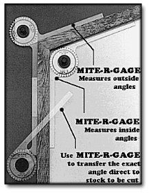 MITE-R-GAGE is a simple and economical tool that can be used to measure or layout angles. The tool allows the professional or do-it-yourselfer to take on difficult jobs involving angular cuts and fits- with professional results. The insert provided with each tool illustrates the primary uses and versatility of MITE-R-GAGE. The insert also gives clear simple instructions for using the tool. After the tool has been used a few times, most people do not need the instructions. It is an excellent companion tool for miter, table, or radial arm saws.